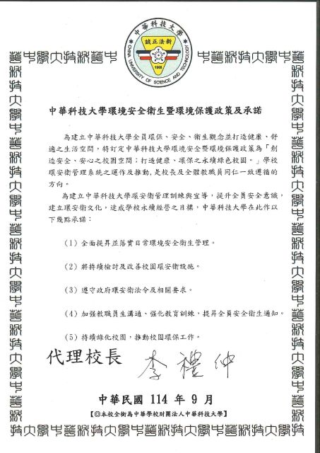 建立本校環安衛管理訓練與宣導,提升全員安全意識,建立環安衛文化,達成學校永續經營之目標,本校在此作以下幾點承諾: